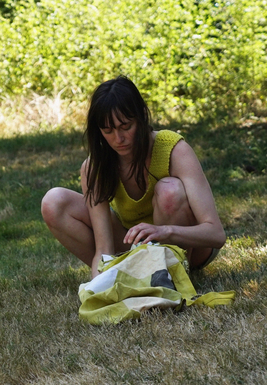 Ses sculptures, à la lisière de l’utilitaire, marquent une accointance entre art et artisanat. Les matériaux sont récupérés, cueillis, teints par des plantes, cuisinés. Cette écologie de travail engage à faire avec ce qui est là. Le textile permet des dispositifs légers, transportables : des surfaces-abris qui se déploient. Fragiles et pragmatiques, ce sont des seuils, des épidermes, qui séparent autant qu’ils relient. Lors d’événements, les actions ne sont pas spécialement performantes, pas vraiment spectaculaires, Lucie y dresse le portrait des territoires et des personnes rencontrées.